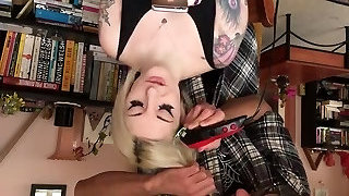 blond with tatoos trims her head