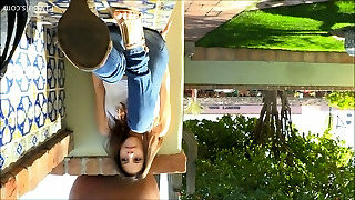 Wife teasing cuckold spouse. She masturbates him and goes nude outside.
