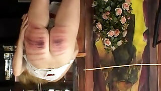 My slender mega-bitch Tamara gets very painful penalized with the cane, in a arkward position.